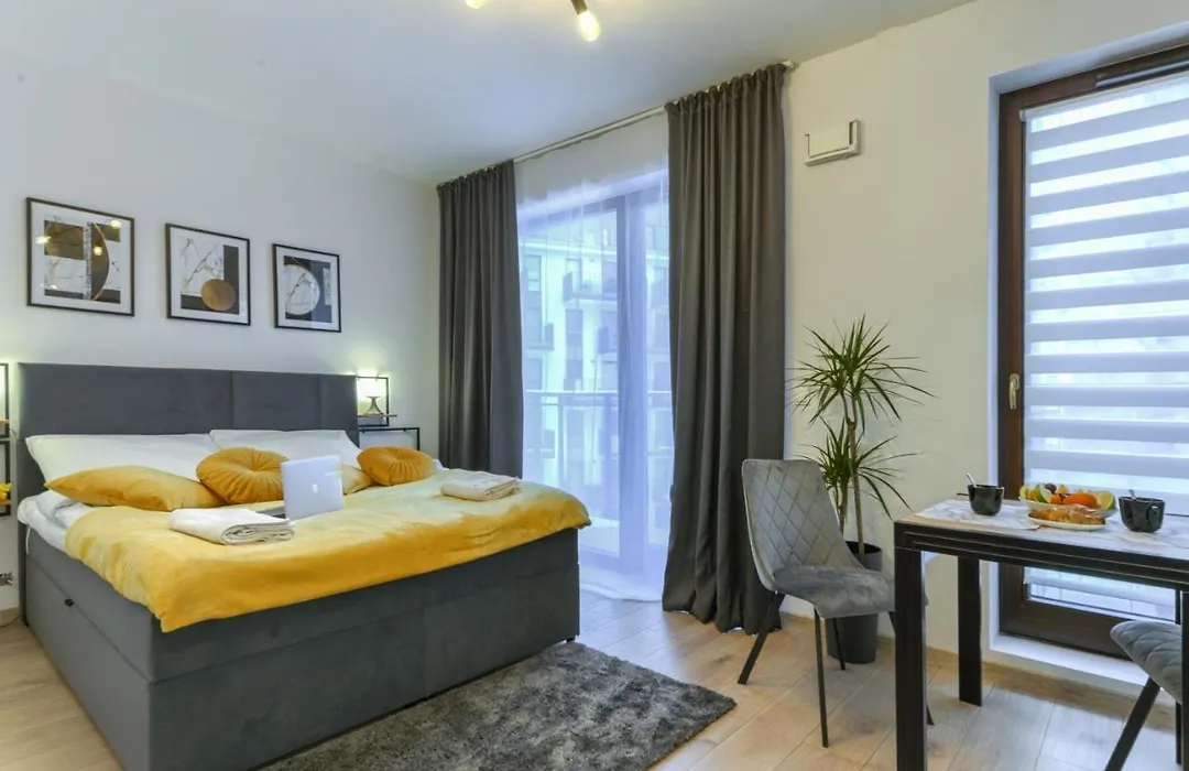Apartament posiada dostęp do kuchni z lodówką, płytą grzejną i przyborami kuchennymi. Z Kazou Residence do lotniska Chopina 5 km.
